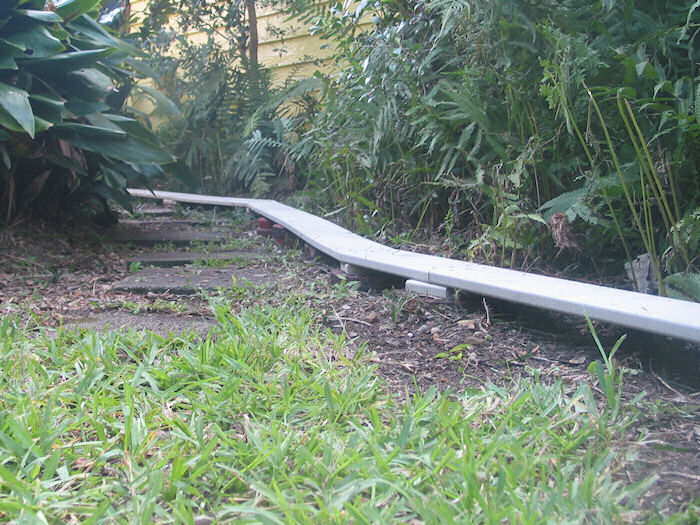 In a rare Sunday afternoon burst of activity, the Chief Arborist and Lead Leveller worked together to settle the remaining roadbed into place. Surveying indicated that the 63 feet of trackage between the Memorial Bell Tower switch and the East Front Porch lead represents an upward incline of 35 inches. Each roadbed section was adjusted in elevation to achieve a nearly smooth and constant grade of 4.6% The photo at right shows the roadbed adjacent to the deck, while the linked photo depicts the roadbed traversing the Magic Portal.