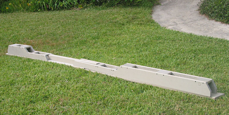 The entire bridge has been constructed by the Rubber and Rawhide Railroad Support Structures Shop off-site. We think the mosquito load of the pond side site was too much to contemplate. Of course, engineering insisted that better tools and more careful design and assembly were the predominant factors affecting that choice. The picture at right shows one "girder section" sub-assembly nearing completion. In the linked photo, all sub-assemblies have been completed and are laid out in approximate location on the upside down on the two 62-inch roadbed sections.